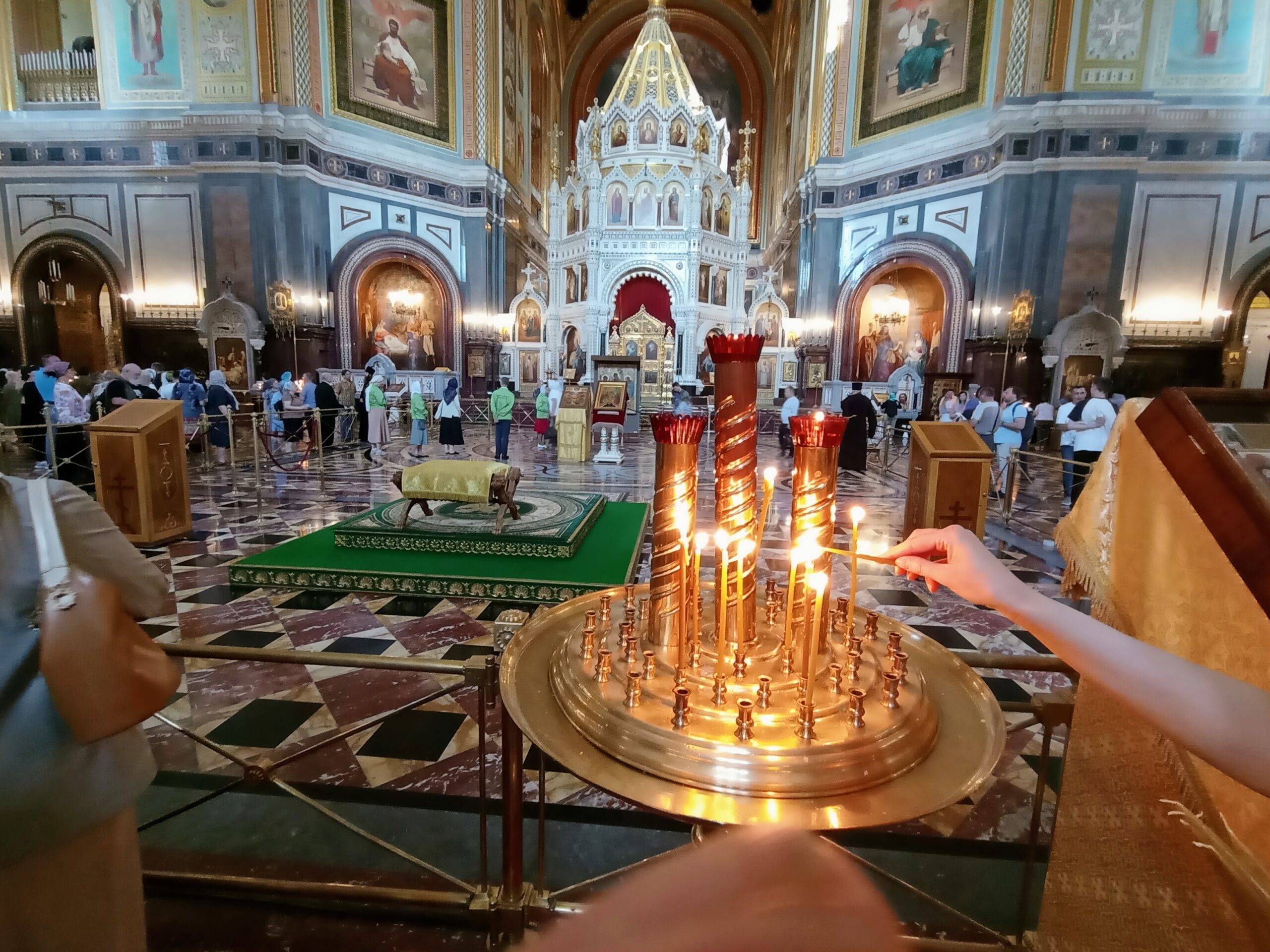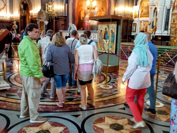 - Onlookers crowd in front of Andrei Rublev’s „Trinity“, one of the most famous Russian icons, at the Cathedral of Christ the Savior on June 18, 2023 The transfer of the icon from Moscow’s Tretyakov Gallery to the cathedral has provoked sharp opposition from art historians. They point out that the approximately 600-year-old icon will suffer serious damage at the room temperature and humidity in the cathedral and at the planned future location in the Holy Trinity Monastery in Sergiyev Possad.